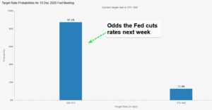 It is worth noting the Fed meets next week on December 10 and according to CME Fed Watch, Fed Funds futures are pricing in an 87% chance the Fed cuts by 0.25% on Wednesday.