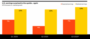 Although Rieder is a bond guy, he certainly put himself out there as a fan of the stock market. Rieder pointed to data showing that profit margins for businesses remain solid and (echoing a theme of The Joseph Group) corporate earnings are fantastic. As shown in the chart below, actual corporate earnings (yellow bars) have exceeded already high expectations (orange bars) for the last three quarters.