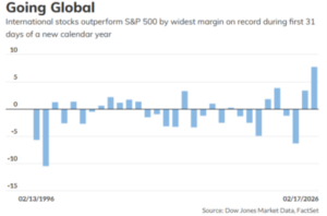 An interesting effect of this sort of changing world has been the impact on markets outside the US. Many developed countries outside the US have grown quite complacent in recent years with things like military spending and economic competitiveness. Capital that might otherwise have been invested in these countries instead poured into the United States. This was good for owners of US stocks and bonds, but not so good for people who owned stocks and bonds outside the US. As this has begun to change and places like Japan and Europe seek to revitalize their economies, we’ve seen their long moribund markets begin to wake up. Take, for example, the performance of non-US stocks over the first 31 trading days of 2026. Non-US stocks have outperformed the S&P 500 by nearly 8%, the best such showing in over 30 years.