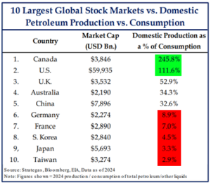 Heading into the conflict with Iran, international stocks were the clear market leaders with the MSCI EAFE Index of foreign stocks up over 10% year to date through the end of February compared to only +0.7% for the S&P 500 through the same period. With the war, foreign stocks are still the year-to-date leaders, but the magnitude of leadership has shrunk as foreign stocks have been hit the hardest. Why? The table below gives some clues and the simple answer is again oil. Countries such as Canada and the United States are effectively energy independent as they produce more oil than they consume. However, countries in Europe and particularly in Asia have a much heavier reliance on oil imports. Japan has to import 96.7% of the oil its population consumes!
