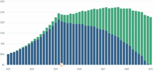 Advisors at TJG typically construct financial plans using a conservative return forecast of 4%. The thinking here is to be as conservative as we can to ensure that even in a low-return scenario, one’s financial plan can work. As you can see, none of the forecasts in the table above are below 4%. Many are above 5% or even 6%. While this difference may not sound large, the impact over the long term is substantial. The graph below shows a hypothetical financial plan for a couple aged 50. The next 15 or so years shows this couple continuing to save and grow their assets before retirement, at which point they begin to live off social security and their investment portfolios. The blue bars show what happens to their investment portfolio over time if they earn an annual rate of 4%. This couple doesn’t spend their investment portfolio down until reaching their mid-90s. Not bad. The green bars show the potential for their plan simply by adjusting the return estimate from 4% to 5%. In this scenario, the couple still has a sizable portfolio even into their mid-90s.