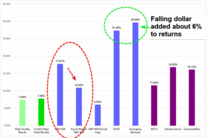 In last week’s WealthNotes, Alex recapped our recent Portfolios and Pints event and included the chart below which shows the YTD (through November 30) performance of indexes representing major asset classes. The key here is the two biggest bars on the chart are the indexes representing international stocks.