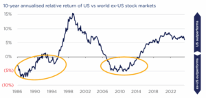 I’m not sure many investors would have predicted international stocks to be the best performing of the major asset classes in 2025, but that’s exactly what has happened. Now the key question is, does international stock performance leadership continue? The gold circles in the chart below show extended periods where foreign stocks did outperform U.S. stocks – it happened in the late 1980s and again in the early 2000’s. As we look at the data, cheaper valuations, accelerating foreign earnings growth, and a weaker dollar could all be factors which mean foreign stock leadership could continue in 2026.
