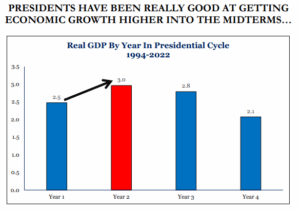 We always try to call it down the middle and focus on “policies” and not “politics.” Here is another example of looking at the facts and learning from history. Next year is a mid-term election year. Mid-terms are typically a time when the economy accelerates (as shown in the chart below) as Presidents try to promote policies which “juice” growth.