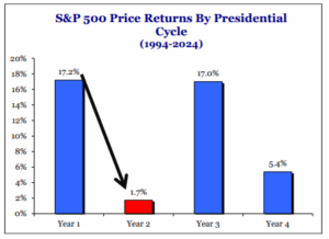 Now, that may sound like a good thing for stocks, but that’s not necessarily what the data shows. In recent years, the second year of the Presidential Cycle (the mid-term election year) has generally been the weakest of the cycle. Why? We would say there are two key reasons. First, the market is generally good at pricing in higher growth before it happens, and second, the higher growth can result in higher interest rates, which seems to coincide with market volatility.