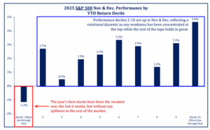 However, as we get into December, we are seeing an interesting phenomenon. Through 12/18, the performance gap between the market cap and equally weighted S&P 500 has narrowed to about 5%. As shown in the chart below, in recent weeks the year’s best performing stocks have declined while “the rest of the stock market” has had positive performance.