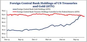 One chart that highlights the changing world is shown below. The behavior of foreign central banks has been quite different in recent years. While these banks have begun to slightly decrease their holdings of U.S. Treasuries, they have dramatically increased their holdings of gold reserves from around $1 trillion a decade ago to close to $3 trillion today.