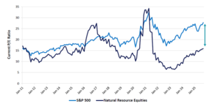 The team also expressed their belief that the market is still largely ignoring companies critical in extracting and processing natural resources. The chart below shows the valuation trends for the S&P 500 and natural resource stocks over the last 15 years. Until Covid-19, there was little daylight between the valuations of these parts of the market. Today, there is a yawning gulf.